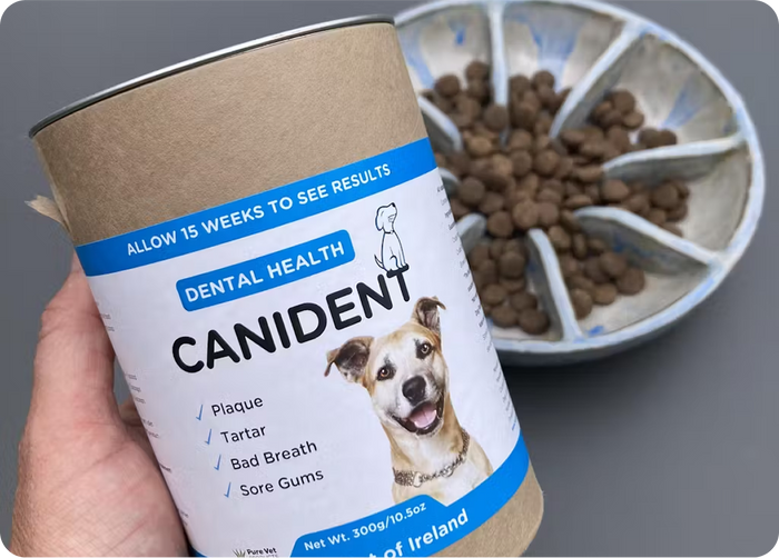 Canident is a natural, vet-approved supplement that harnesses the power of 3 organic Irish seaweeds to support your dog’s dental health from the inside out. Just sprinkle it over their food once a day, no brushing battles or stressful routines needed.